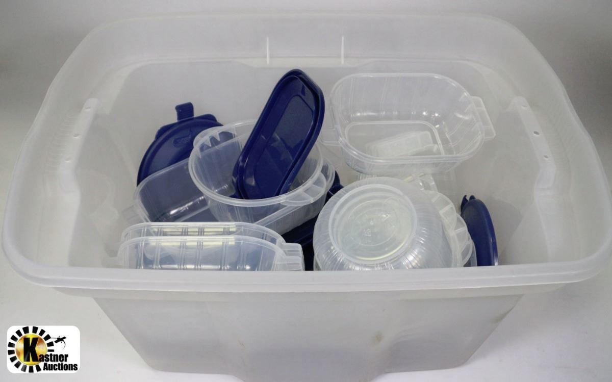 BIN OF MICROWAVABLE TUPPERWARE CONTAINERS & LIDS