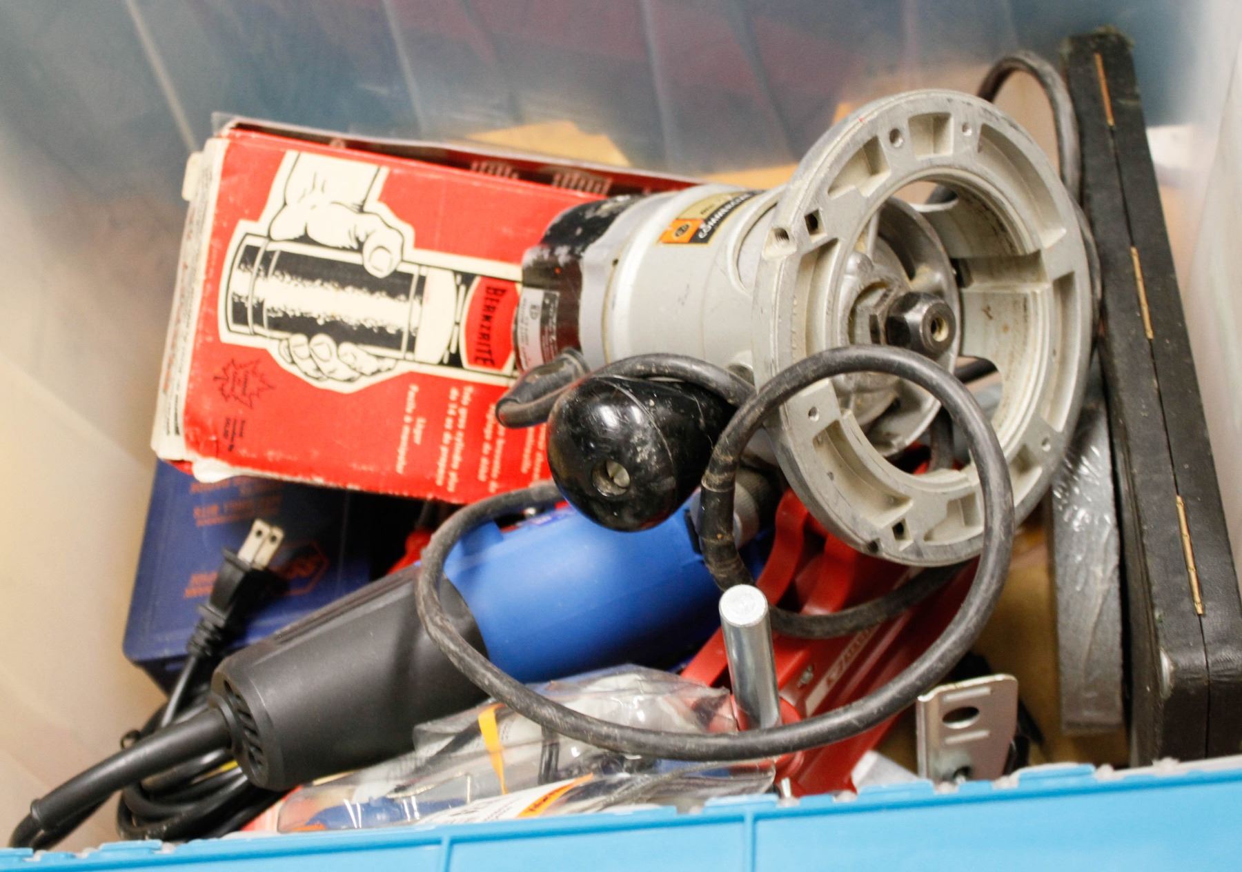 BIN OF TOOLS: DIE GRINDER, ROUTER, NEW TOOLS AND