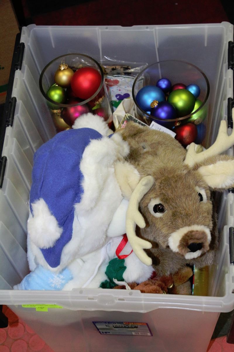 PIGGY BANK & 3 DECORATIVE VASES FULL OF TREE DECORATIONS, ETC.