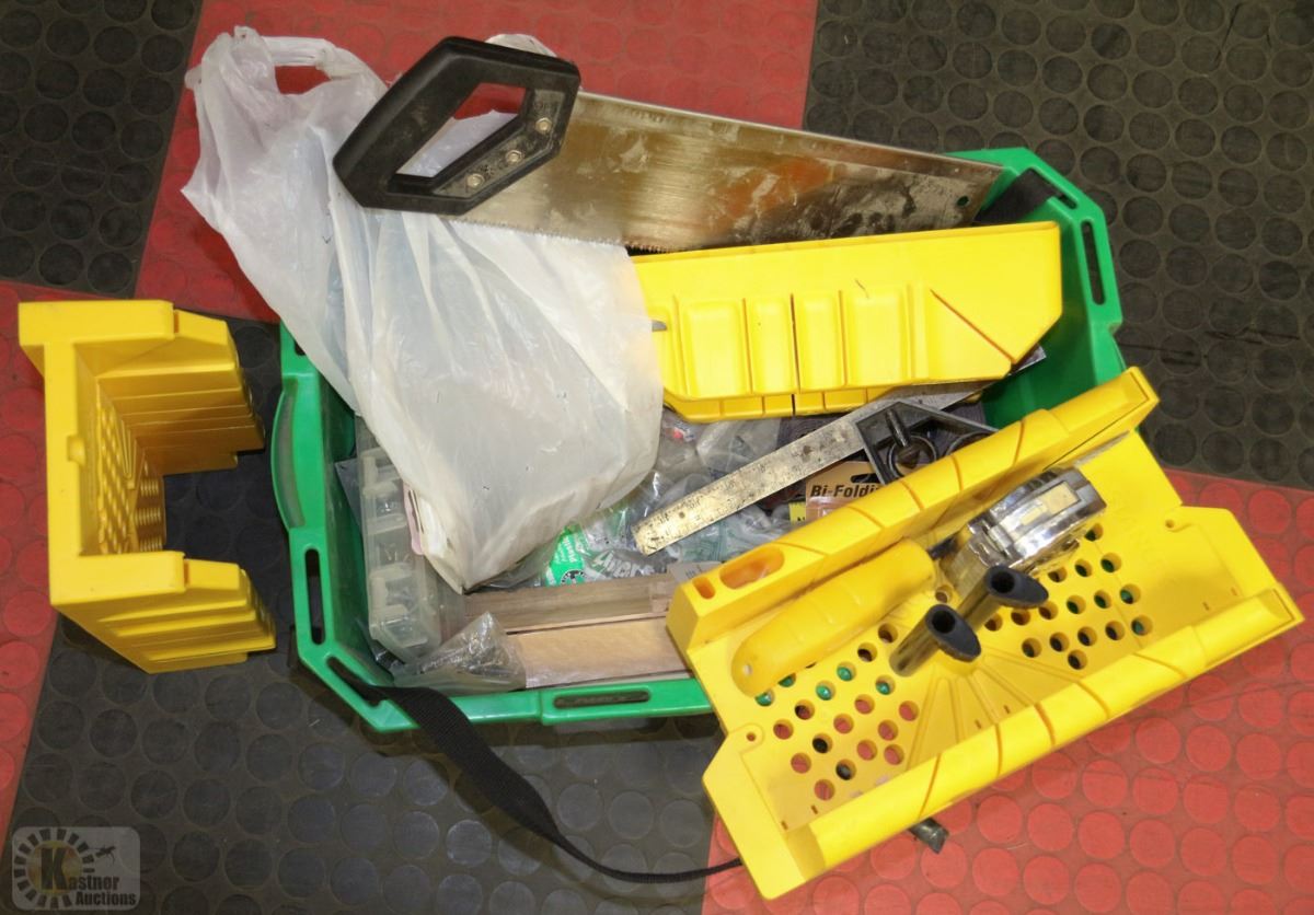 BIN WITH MITRE SAW ACCESSORIES AND MORE