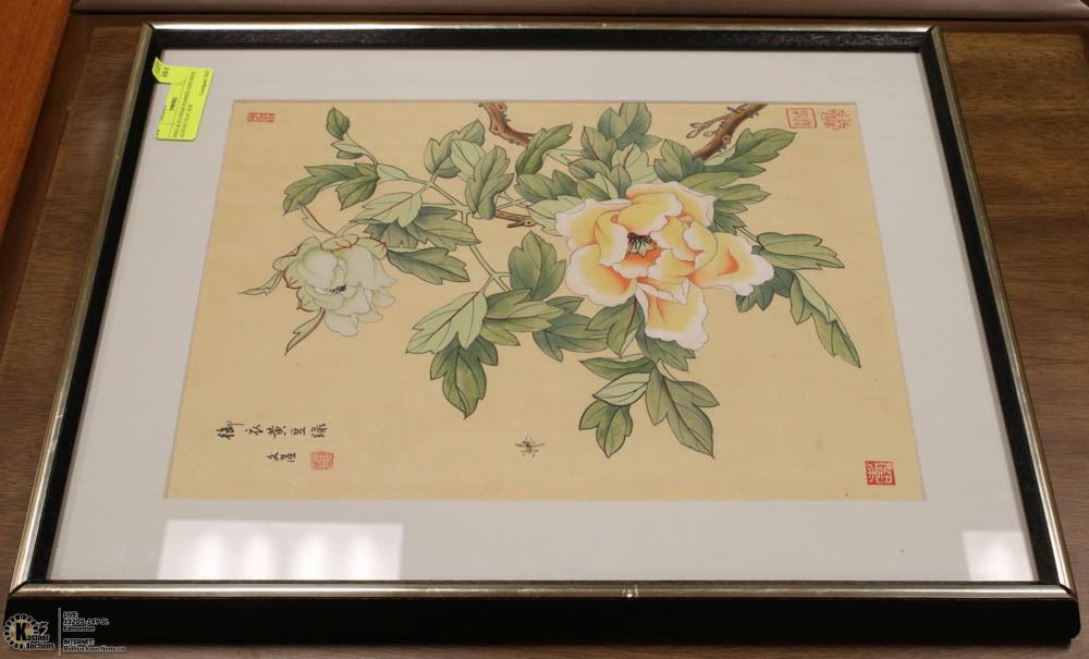 AND BRIGHT COLORS ON SILK 16" X 12" INSCRIPTION, SEALS OF ARTIST AND COLLECTORS