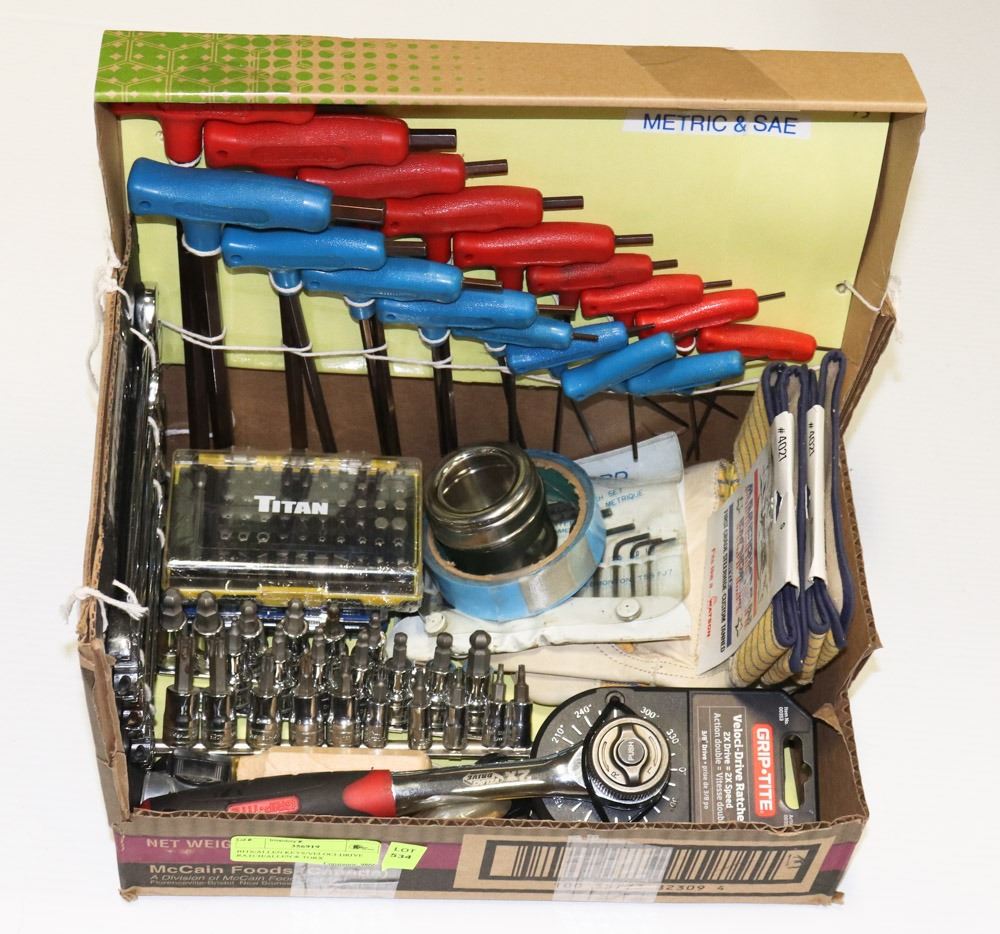 T-HANDLE ALLEN KEYS (9 SAE, 8 METRIC), CRAFTSMAN 4-PC OPEN-ENDED RATCHETING WRENCHES, VELOCI-DRIVE RATCHET "GRIP-TITE" /8", 13 3/8" SOCKETS METRIC & SAE ALLEN KEYS, 10 SECURITY TORX 3/8" SOCKET, 10 METRIC ALLEN KEYS, 60-PC MASTERCRAFT SPECIALTY BIT SET, NEVER-OPENED TITAN SPECIALTY BIT SET, SPECIMEN CONTAINER, BLUE TAPE, 3 PR WORK GLOVES, + MISC.