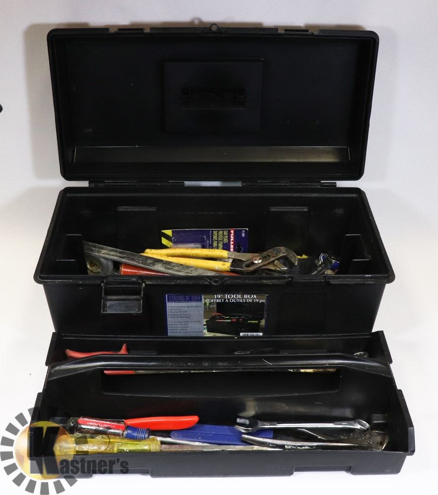 BLACK 19" TOOL BOX FILLED W/ TOOLS