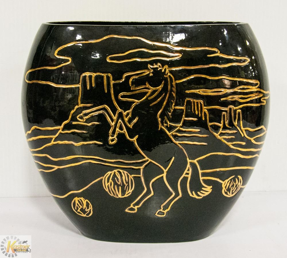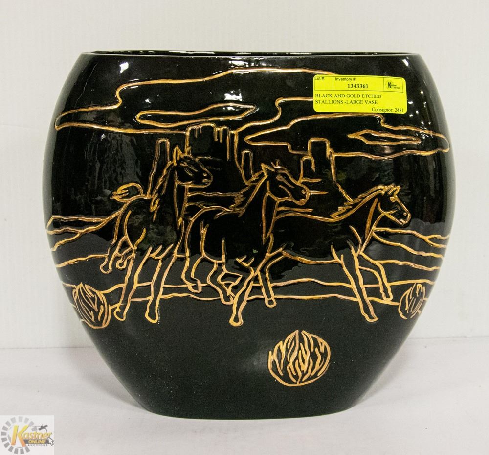 BLACK AND GOLD ETCHED STALLIONS -LARGE VASE