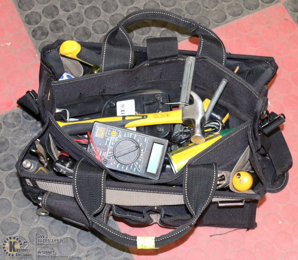 BLACK TOOL BAG WITH TOOLS INCL MULITMETER & MORE