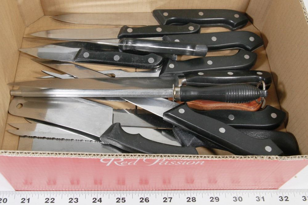 2 CLEAVERS, 2 SERRATED, 3 CARVING LARGE, 3 CARVING MEDIUM, 1 PARING, 1 SHARPENING STEEL, 2 CARVING FORKS