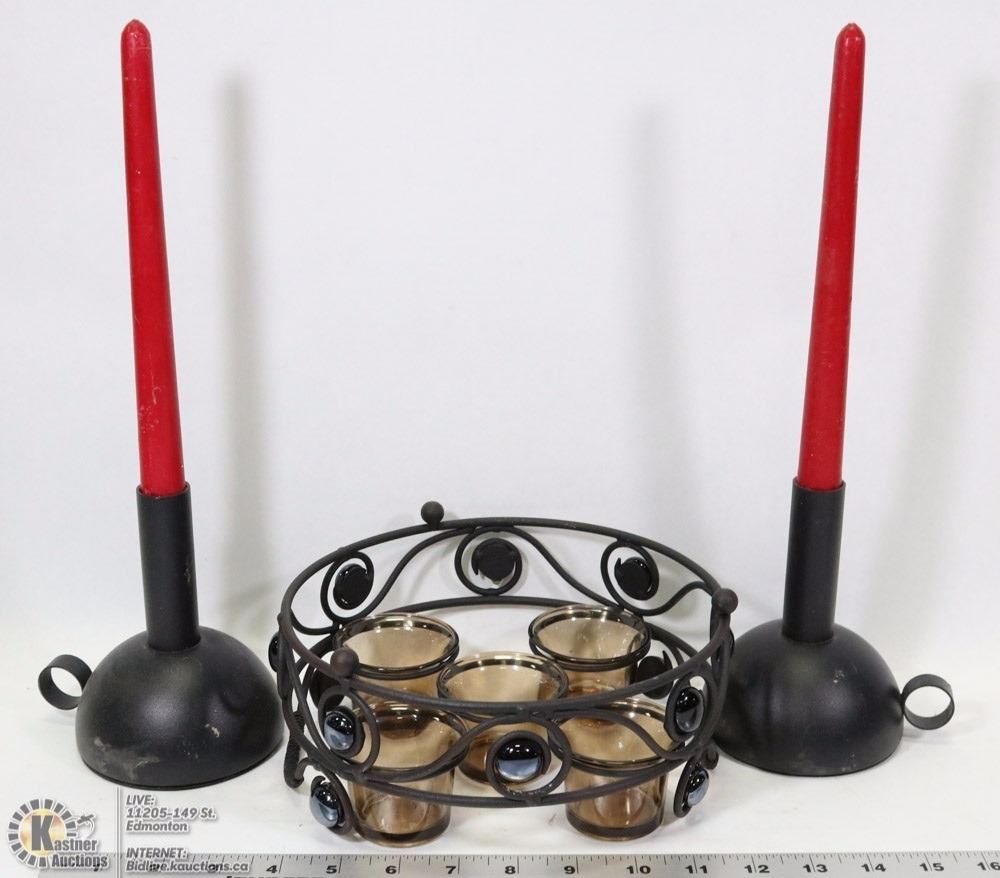 ONE PATIO CANDLE SET AND 2 BLACK ROUND CANDLE BASES WITH CANDLES