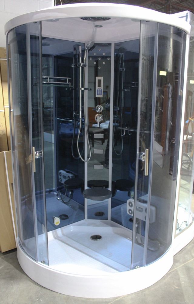 44'' X 44'' X 87 FEATURES: STEAM, OVER LED RAIN SHOWER, HAND HELD SHOWER, BODY JET, FOOT MASSAGER, SHAMPOO RACK, TOWEL RAIL, LED LIGHTING, FM RADIO / CD INPUT, AROMATHERAPY PORT, BUILT IN SEAT.RETAILS FOR $3,900