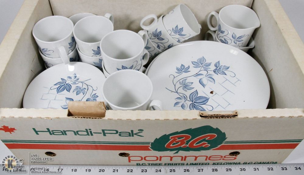 12 DINNER PLATES, 2 PITCHERS, 17 CUPS, 12 SAUCERS, 5 PIE PLATES. HOUSEHOLD