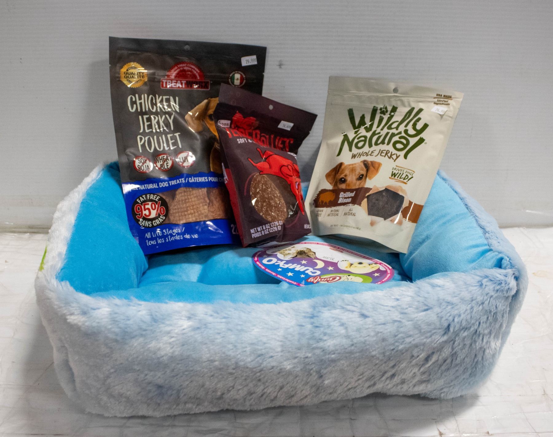BLUE PLUSH SIZE SMALL PET BED SOLD WITH TREATS