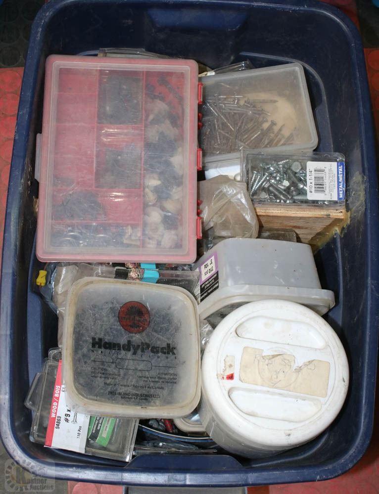 BLUE TOTE FULL OF ASSORTED NAILS AND SCREWS