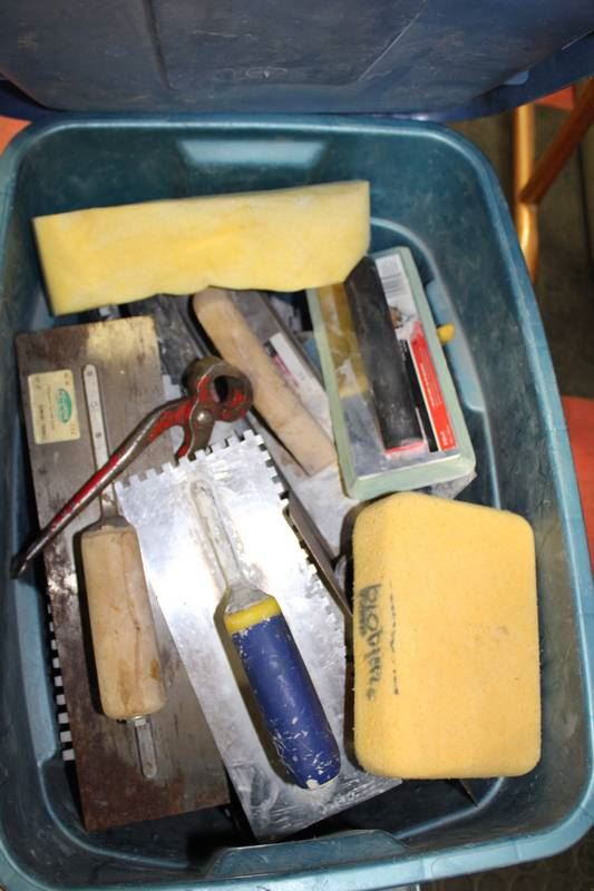 BLUE TOTE OF DRYWALL & GROUTING SUPPLES