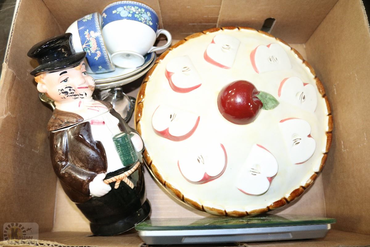 BONE CHINA TEA CUPS & SAUCERS,COVERED APPLE PIE PLATE AND FOOD SCALE