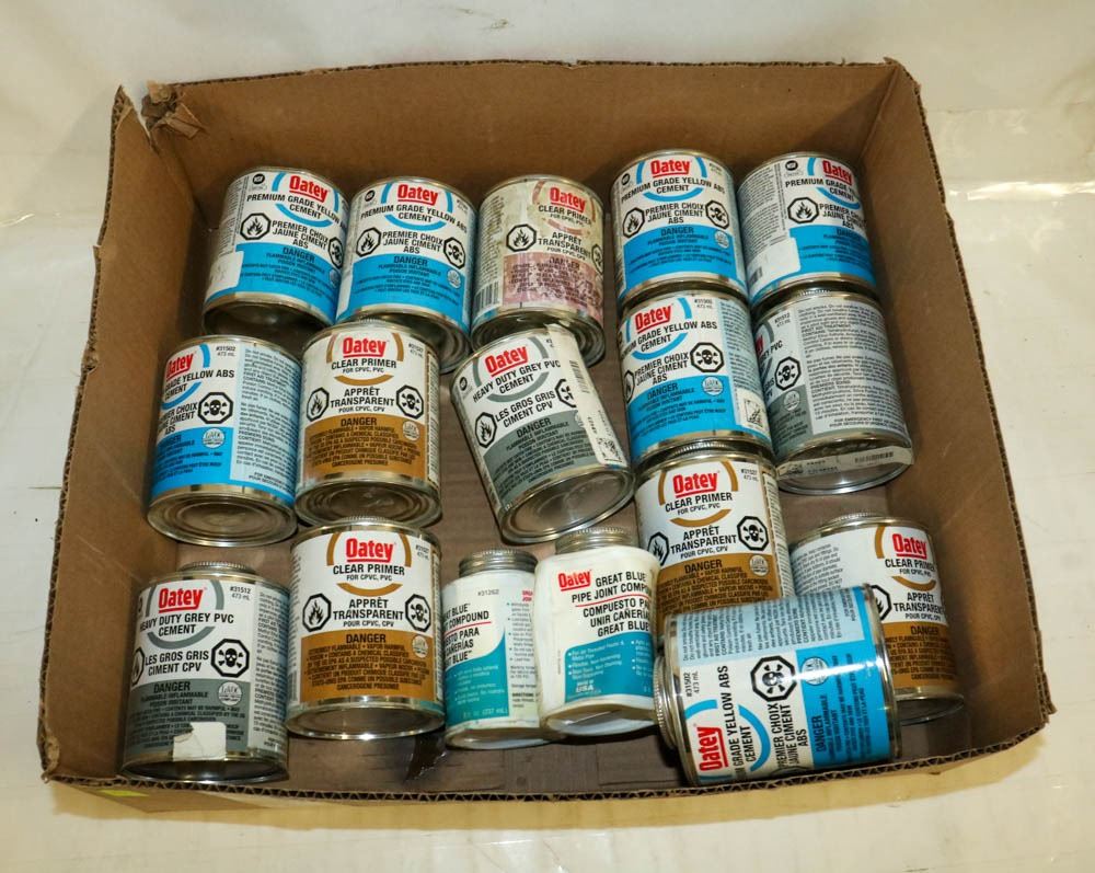BOX FULL OF ASSORTED OATEY PRIMERS FOR PVC/CEMENT