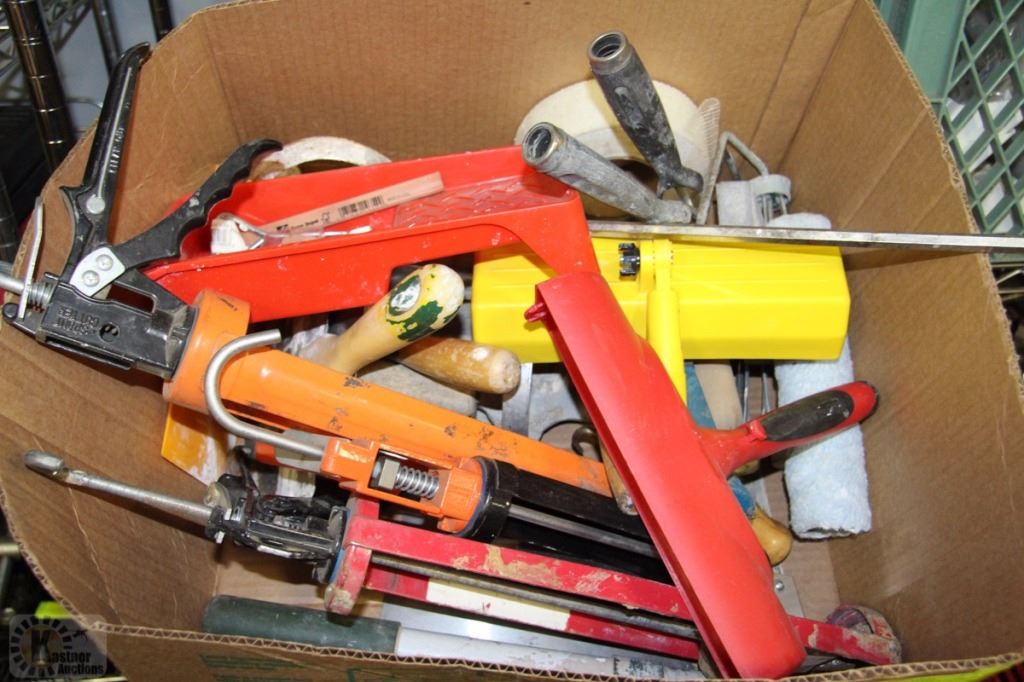 BOX FULL OF PAINTER & DRYWALL SUPPLIES