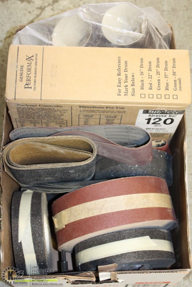 BOX FULL OF SANDING BELTS, ROLLS, VARIOUS GRIT