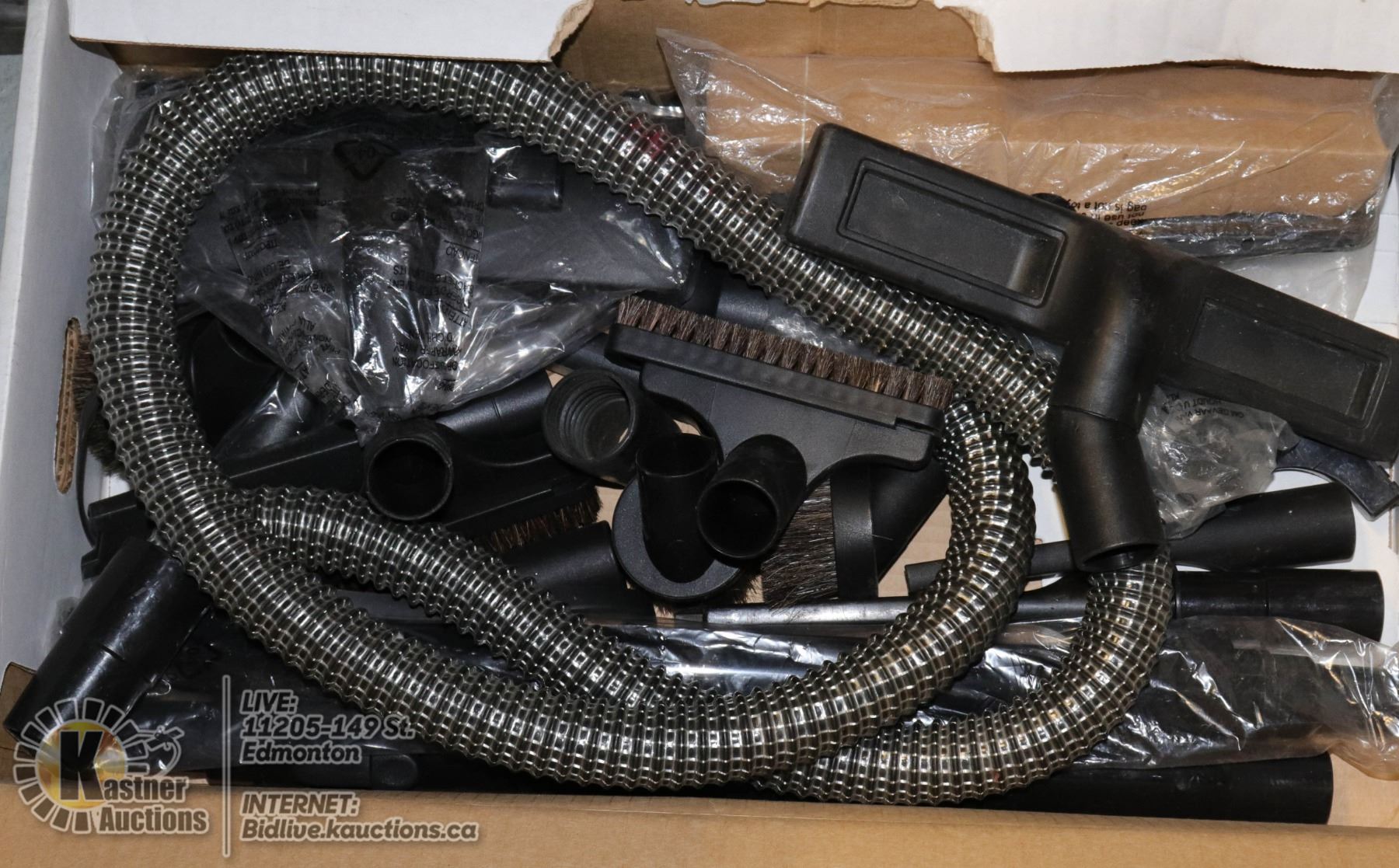 BOX FULL OF VACUUM PARTS AND HOSE INCL. NEW EXTENDABLE WANDS, NEW FLOOR ATTACHMENTS, OTHER NEW ACCES