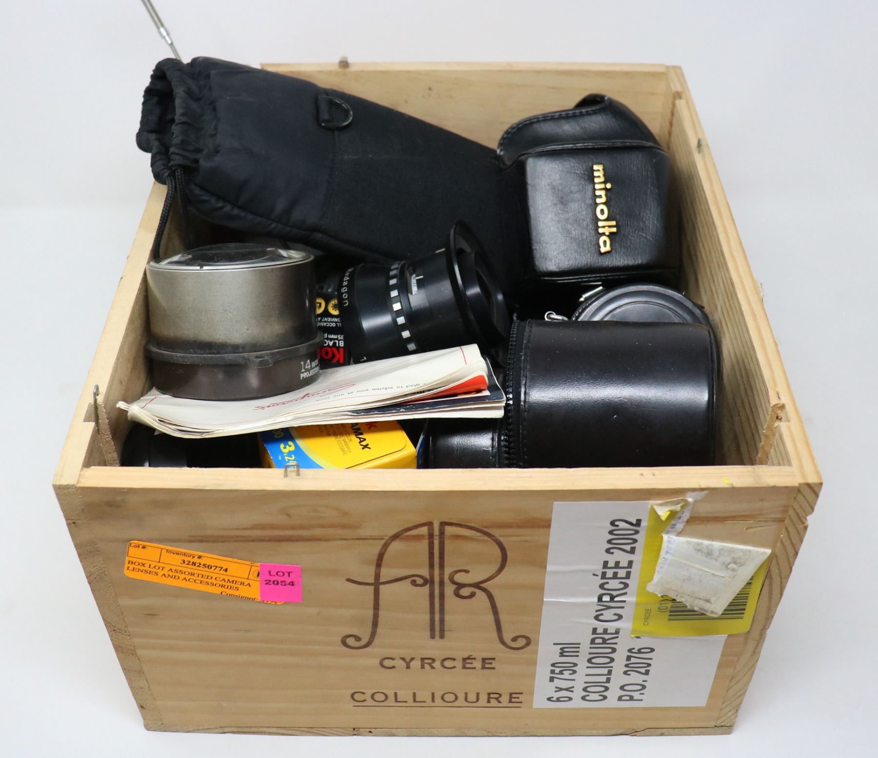 BOX LOT ASSORTED CAMERA LENSES AND ACCESSORIES
