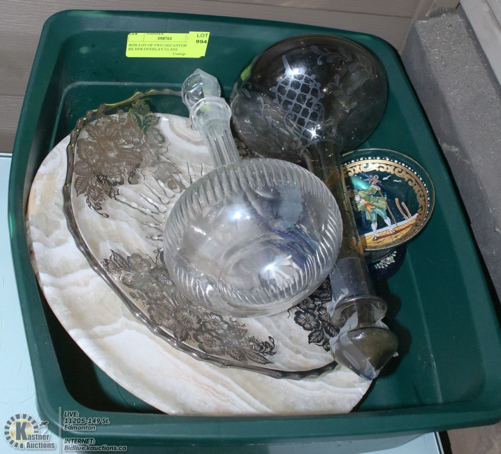 BOX LOT OF TWO DECANTERS AND SILVER OVERLAY GLASS