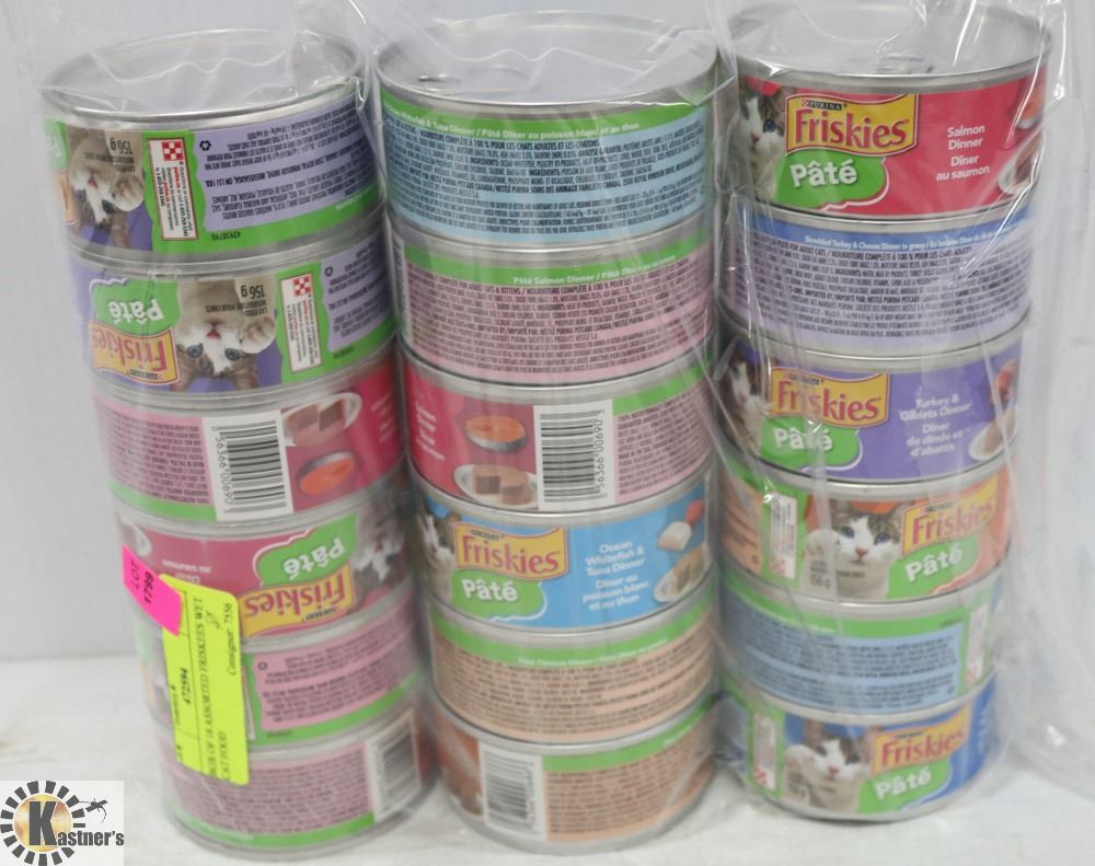 BOX OF 18 ASSORTED FRISKIES WET CAT FOOD