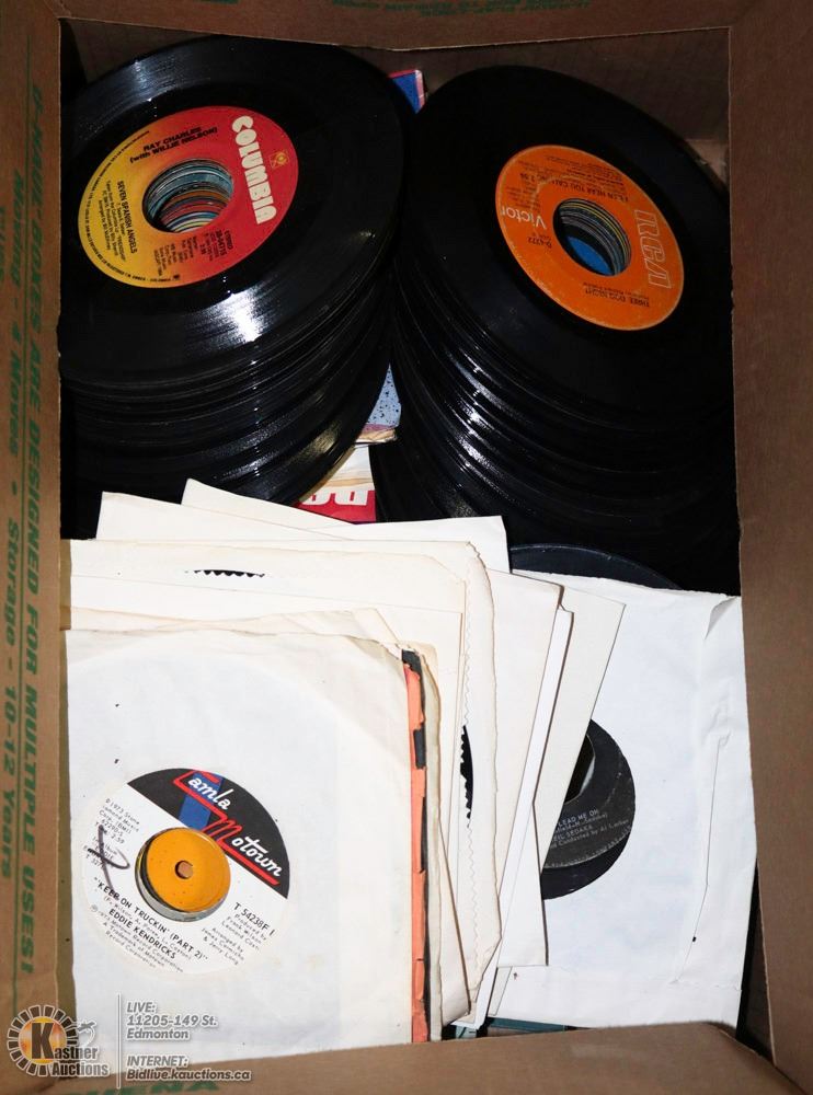 BOX OF 45 RPM RECORDS INCL ROLLING STONES