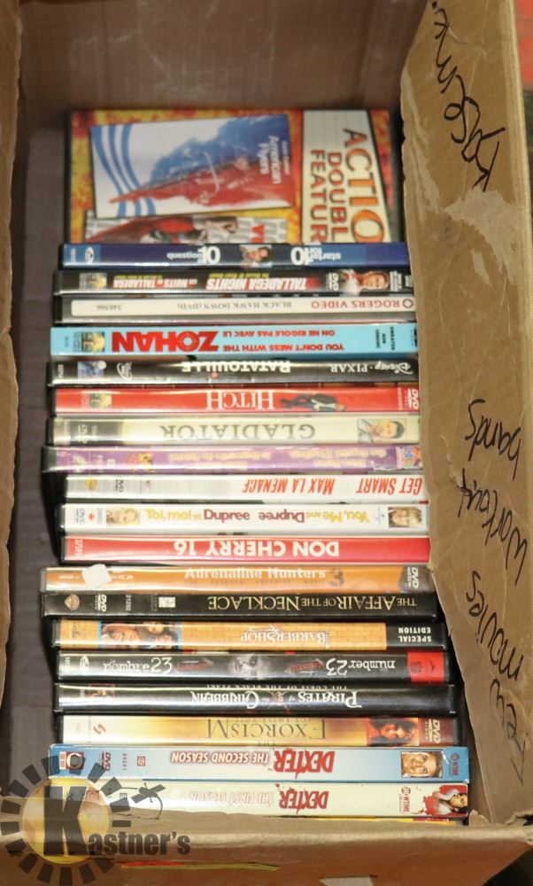 BOX OF ABOUT 40 TOTAL DVDS INCL DEXTER, GLEE,