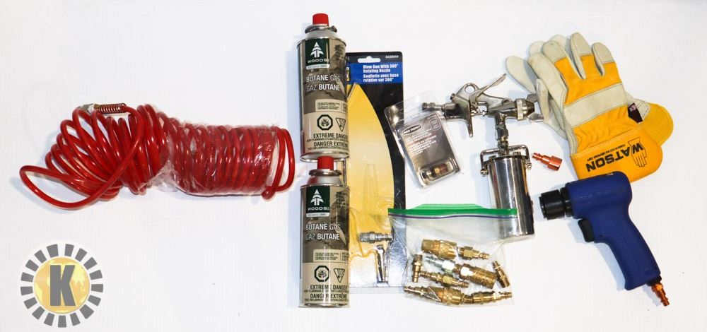 ESTATE. BOX INCLUDES: AIR HIGH SPEED SANDER, AIR GUN, BLOW GUN, WORK GLOVES, AIR FITTINGS AND MORE***ITEM(S) LOCATED IN LETHBRIDGE ALBERTA