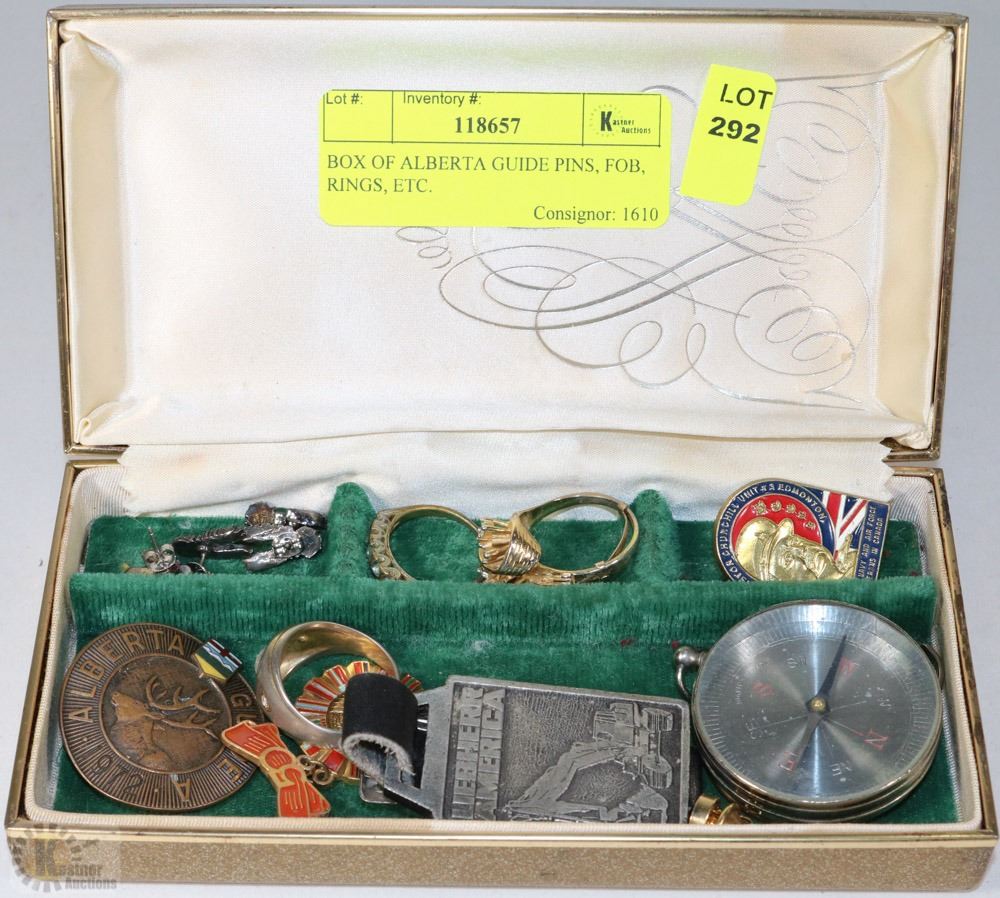 BOX OF ALBERTA GUIDE PINS, FOB, RINGS, ETC.