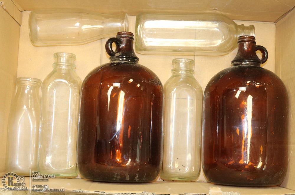 BOX OF ANTIQUE MILK AND 1 GAL JUGS