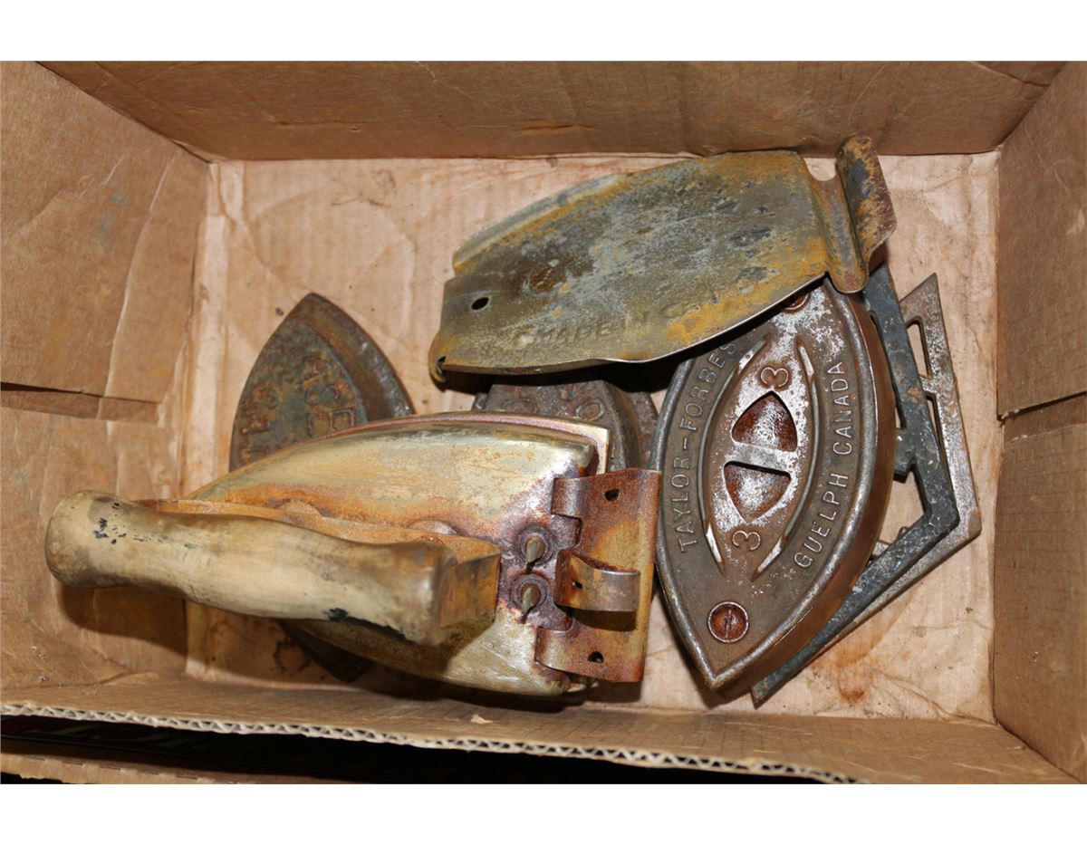 BOX OF ANTIQUE SAD IRONS