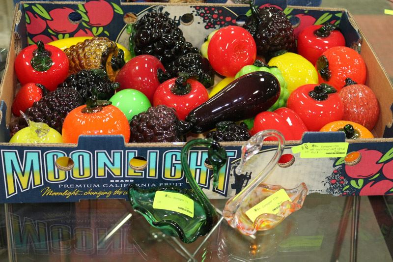 BOX OF ART GLASS FRUIT SOLD W 2 SMALL ART GLASS