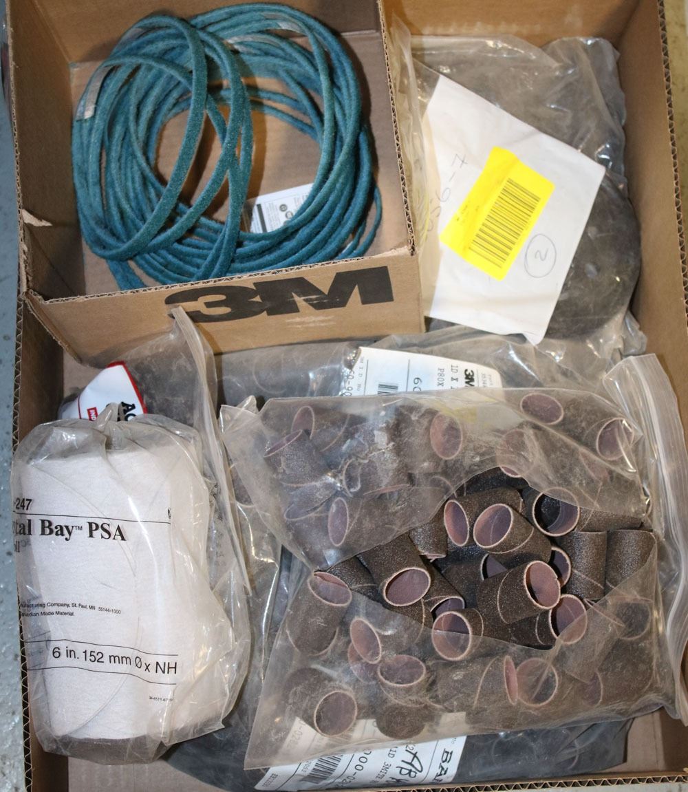 BOX OF ASSORTED 3M SANDING CONES, DISCS, AND BELTS