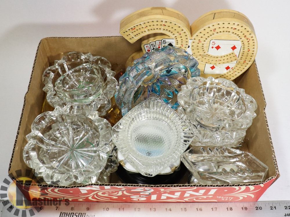 BOX OF ASSORTED ASHTRAY, CRIB BOARD, CARD BOX,