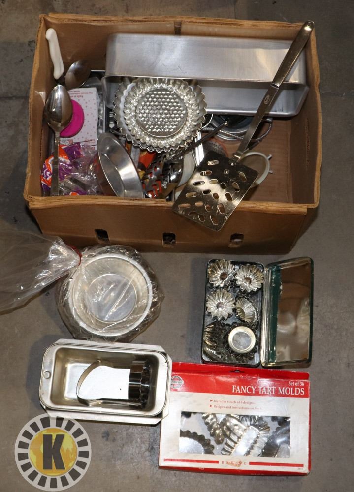 BOX OF ASSORTED BAKING AND OTHER KITCHEN UTENSILS