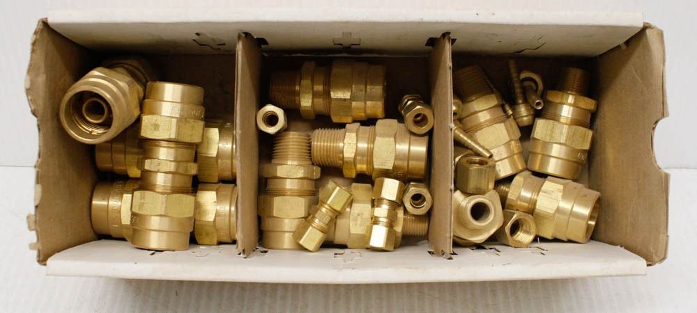 BOX OF ASSORTED BRASS HOSE SPLICERS & FITTINGS