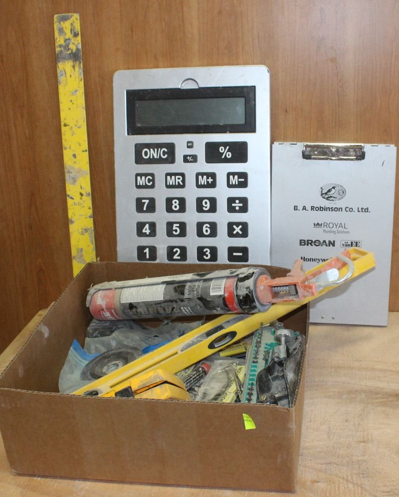 BOX OF ASSORTED CARPENTRY TOOLS & MORE