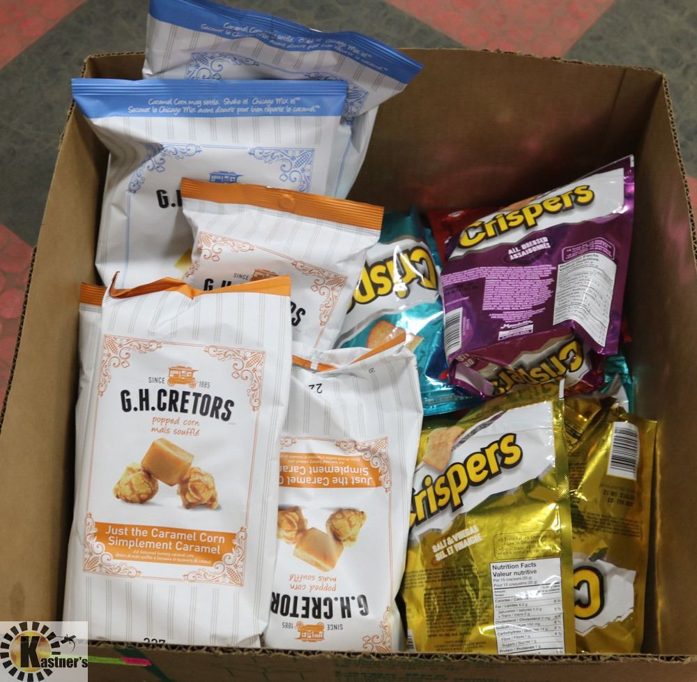 BOX OF ASSORTED CRISPERS & G.H.CRATORS POPCORN