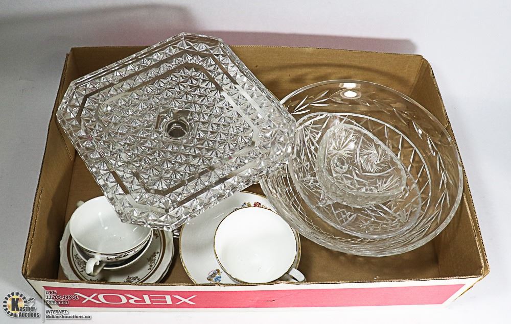 BOX OF ASSORTED CUT GLASS AND BONE CHINA