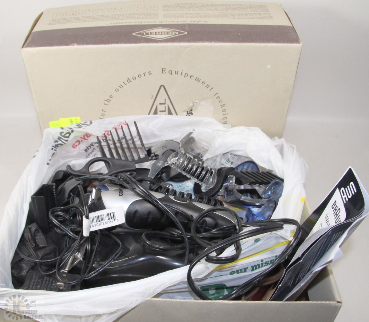 BOX OF ASSORTED DOG CLIPPERS & ACCESSORIES