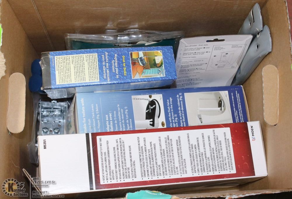 BOX OF ASSORTED ELECTRICAL, TOILET PARTS AND MORE
