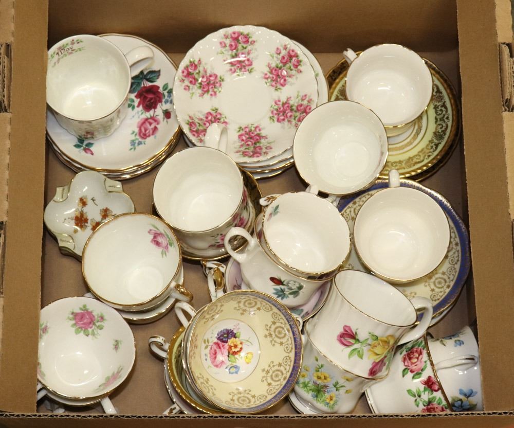 BOX OF ASSORTED FINE CHINA CUPS AND SAUCERS