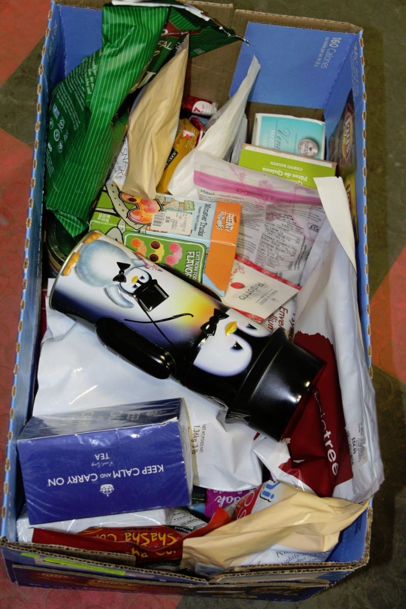 BOX OF ASSORTED FOODS,SNACKS,CANDIES,GIFTWARE