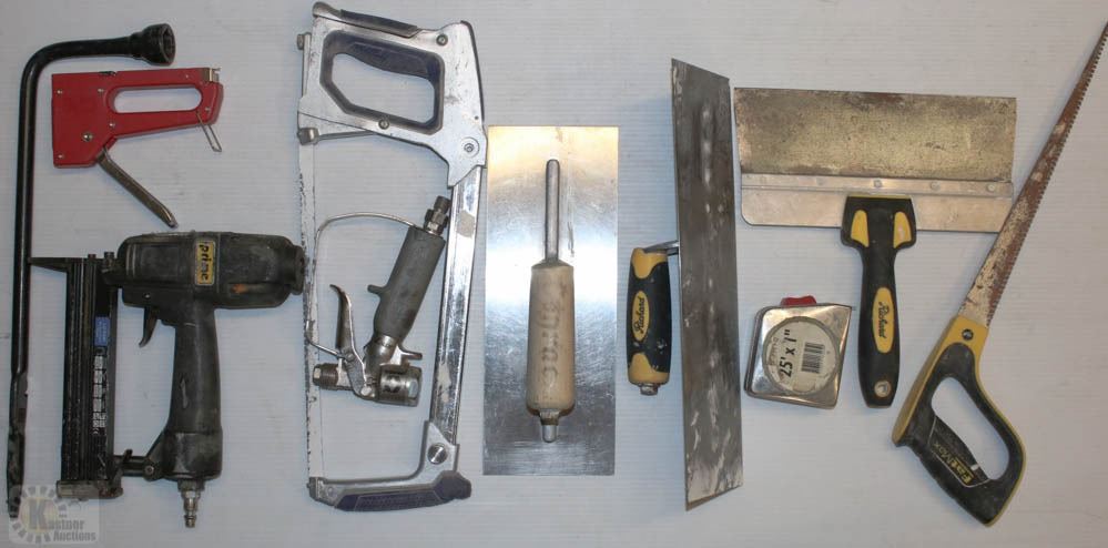 BOX OF ASSORTED HAND TOOLS AND AIR TOOLS