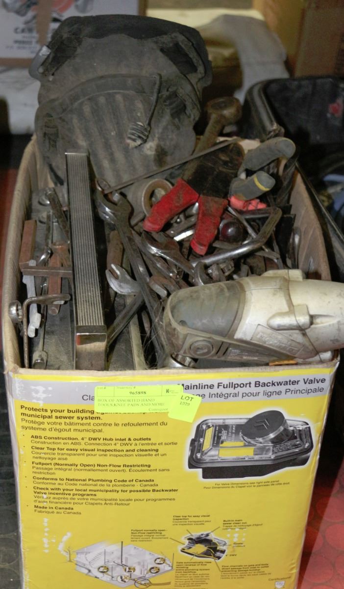 BOX OF ASSORTED HAND TOOLS,KNEE PADS AND MORE