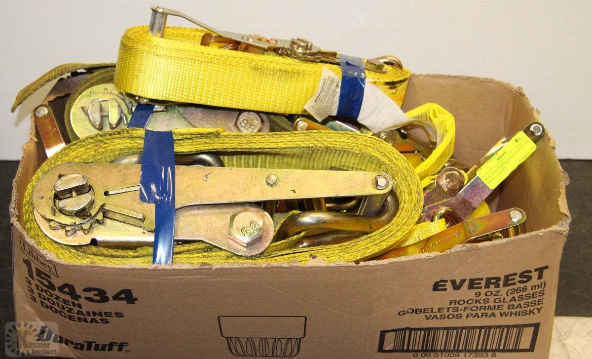 BOX OF ASSORTED HEAVY DUTY TIE DOWN STRAPS