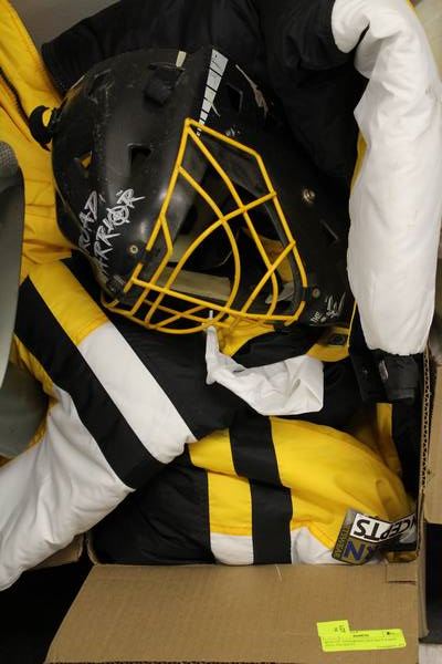BOX OF ASSORTED HOCKEY PADS AND JACKETS