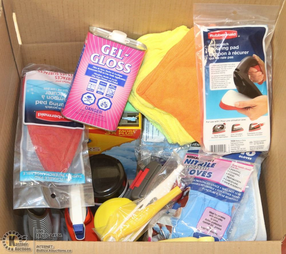 BOX OF ASSORTED HOUSEHOLD CLEANERS & ACCESSORIES
