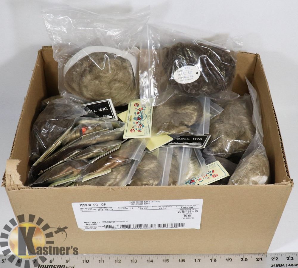 BOX OF ASSORTED NEW DOLL HAIR/WIGS.