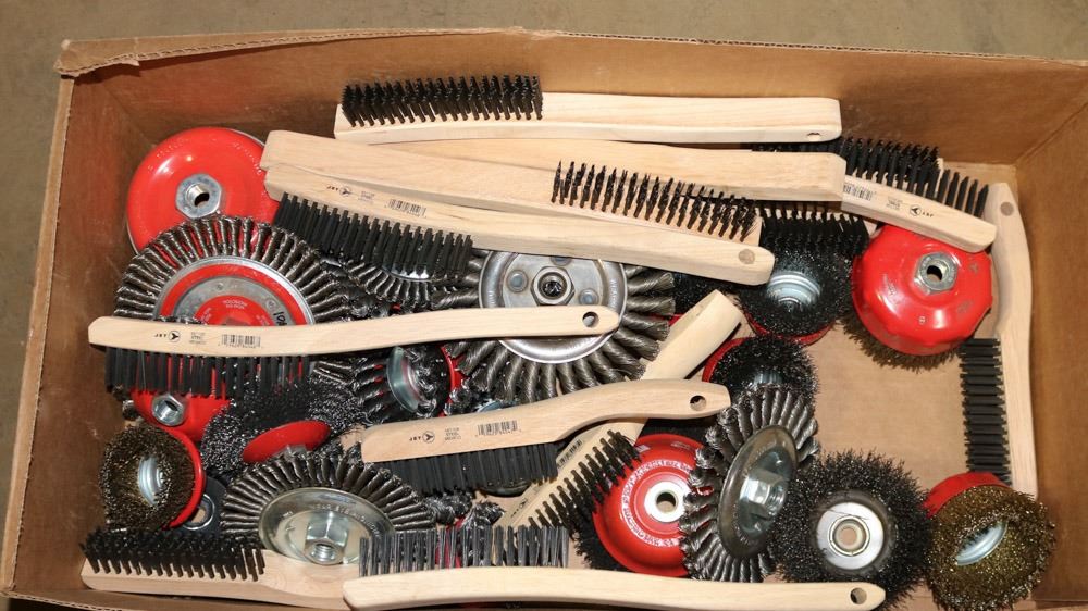 BOX OF ASSORTED WIRE BRUSHES & WHEEL BRUSHES