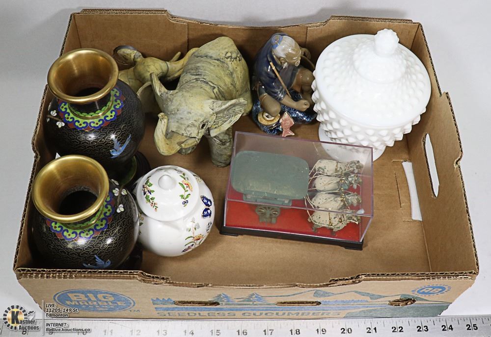 BOX OF ASSORTED ORNAMENTS INCL MILK GLASS,